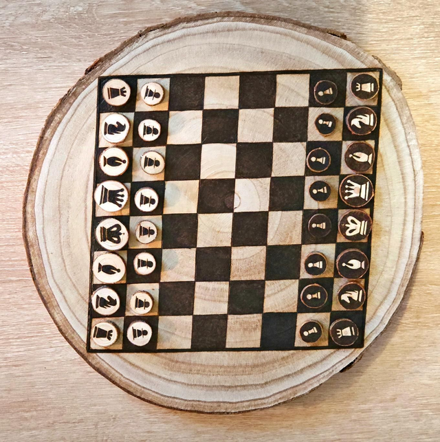 Chaque pièce et le plateau sont finement décorés grâce à la technique traditionnelle de la pyrogravure, offrant des détails uniques et authentiques.