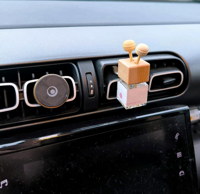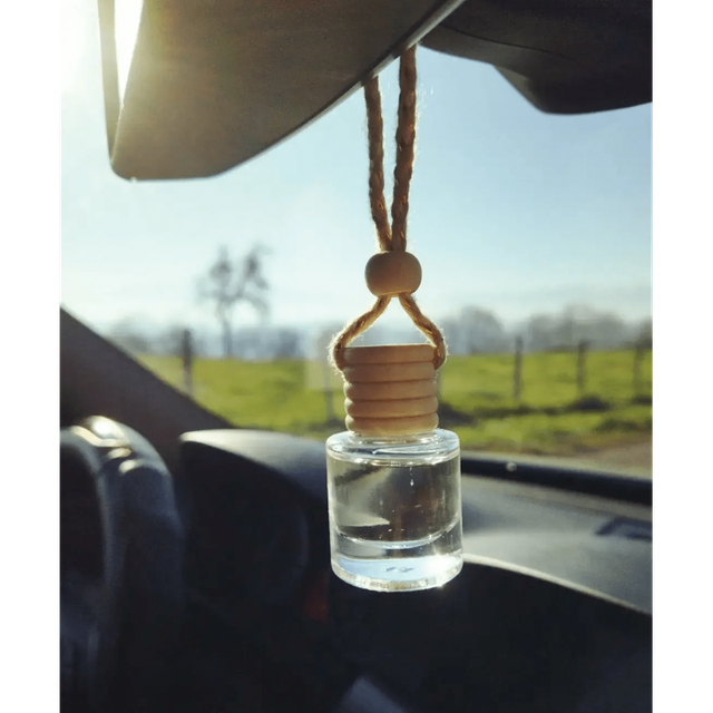 1 - une petite fiole suspendue à votre rétroviseur central et à retourner pour faire imbibé le bouchon en bois du parfum.
